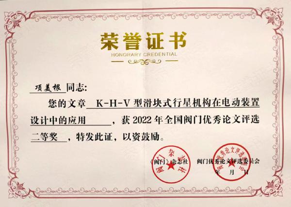 由黃山良業(yè)智能控制股份有限公司項(xiàng)美根終身名譽(yù)董事長(zhǎng)撰寫(xiě),并發(fā)表在2022年第五期《閥門(mén)》雜志上的論文《K-H-V型滑塊式行星機(jī)構(gòu)在電動(dòng)裝置設(shè)計(jì)中的應(yīng)用》,榮獲2022年全國(guó)閥門(mén)優(yōu)秀論文二等獎(jiǎng)。